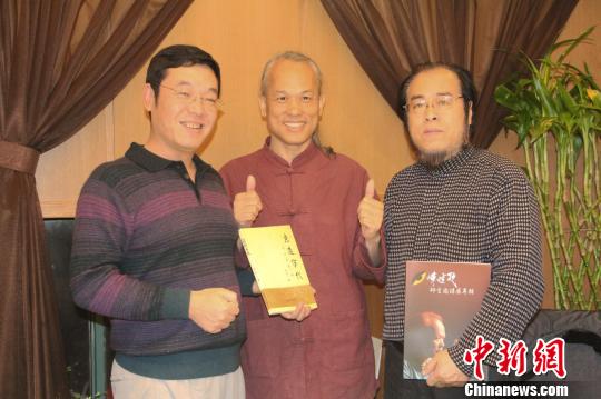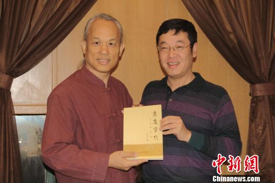 12月3日至8日,“臺(tái)灣民間博物館交流團(tuán)”一行20人在陜西參訪。圖為被譽(yù)為“臺(tái)灣微雕第一人”的陳逢顯先生與陜西文化名人切磋交流、相談甚歡,并接受著名書法家、書法理論家張珂贈(zèng)送的其書法理論專著《意造宋代》!√镞M(jìn) 攝