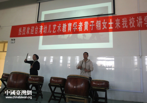表演者叫黃子翎,臺北人,從事戲劇和擊鼓表演已近二十年,表演足跡踏過歐、亞、非等大洲。她不僅是位藝術家,還是一位教育者。她用精彩的表演把同學們帶入藝術的境地,用自己的切身感受向同學們傳授什么是藝術,怎樣把藝術的種子散播到幼兒的心中。