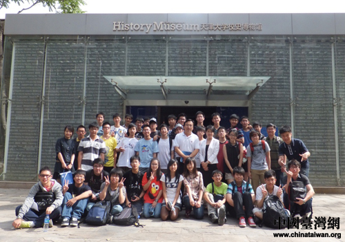 臺(tái)灣臺(tái)北市麗山高級(jí)中學(xué)代表團(tuán)在天津大學(xué)校史博物館前合影留念。(圖片來源:天津市臺(tái)辦)