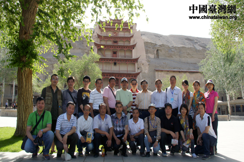 2012年海峽兩岸新聞媒體“陸上三峽行”采訪團(tuán)在敦煌莫高窟合影。(中國臺灣網(wǎng)發(fā))