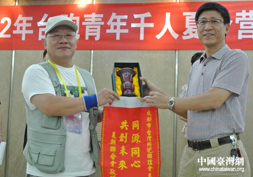 臺灣夏潮聯(lián)合會領(lǐng)隊向臺聯(lián)贈送“同源同心 共創(chuàng)未來”錦旗。(圖片來源:四川省臺聯(lián))