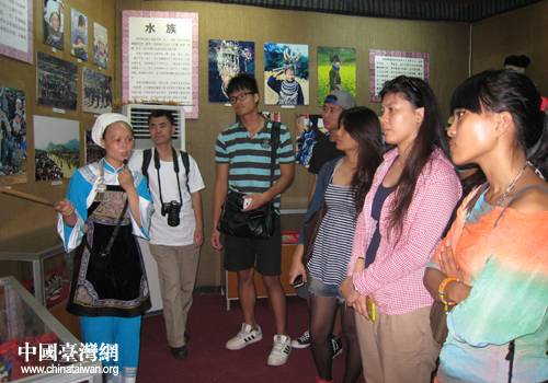中國(guó)臺(tái)灣網(wǎng)7月19日三都消息 日前,2012年臺(tái)灣青年千人夏令營(yíng)貴州分營(yíng)踏上三都水族自治縣。走進(jìn)水族民族博物館領(lǐng)略神秘的水族文化。三都是全國(guó)唯一的水族自治縣,水族人口占全縣人口的80%,水族有自己的文字和語(yǔ)言。