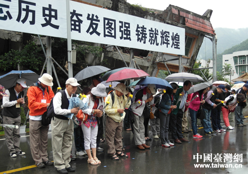 中國臺(tái)灣網(wǎng)5月23日綿陽消息 日前,臺(tái)灣高雄市青溪總會(huì)理事長(zhǎng)、臺(tái)灣文教經(jīng)貿(mào)交流協(xié)會(huì)理事長(zhǎng)率臺(tái)灣南部社團(tuán)菁英一行41人組成的“2013年四川自然文化遺產(chǎn)之旅”參訪團(tuán)到綿陽參訪。參訪團(tuán)一行冒雨先后考察了北川縣地震遺址、“5.12”汶川地震紀(jì)念館、北川新縣城,了解綿陽災(zāi)后恢復(fù)重建后經(jīng)濟(jì)社會(huì)發(fā)展情況,感受綿陽發(fā)展振興的新氣象。