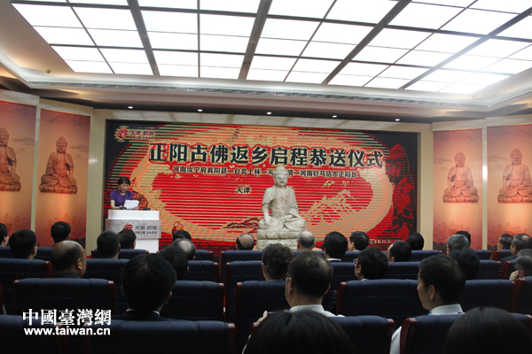 中國臺灣網7月5日天津消息 4日上午,佛像回歸原鄉(xiāng)恭送儀式在天津舉行。經過兩岸文物專家合力“尋根”,臺灣收藏家葉景成先生捐贈天津的一尊500年正陽古佛從天津起運,回歸原鄉(xiāng)河南駐馬店正陽縣。