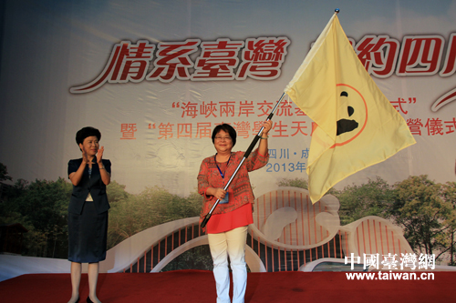 四川省人民政府副省長黃彥蓉向“臺灣學(xué)生天府夏令營”團(tuán)長、臺灣新北市三峽中學(xué)校長劉臺光授“第四屆臺灣學(xué)生天府夏令營”營旗。(中國臺灣網(wǎng) 馬迪 攝)