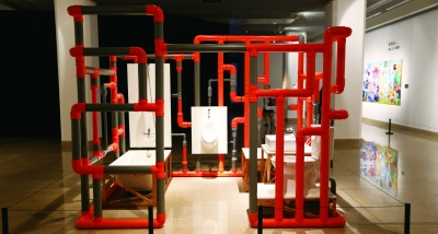 除了兩岸藝術(shù)家作品間的交互設(shè)置,作品與觀眾的交流和互動(dòng)也可圈可點(diǎn)。大陸藝術(shù)家許仲敏的《樓》不斷閃著眩目的藍(lán)光,當(dāng)觀眾走近它時(shí),這件龐大的互動(dòng)裝置會(huì)自動(dòng)旋轉(zhuǎn)起來(lái),八層“樓”上的“眾生”形象也在旋轉(zhuǎn)中變幻,展示了藝術(shù)家對(duì)生命輪回的新認(rèn)識(shí);臺(tái)灣藝術(shù)家蔡坤霖的裝置作品將家庭日常用具用水管連接起來(lái),當(dāng)觀眾觸碰水龍頭開(kāi)關(guān)時(shí),就會(huì)聽(tīng)見(jiàn)水管發(fā)出的聲音,從而產(chǎn)生不同的視覺(jué)想象與體驗(yàn);大陸藝術(shù)家吳玨輝的影像作品,讓觀眾看到被拍攝的小物品在屏幕上放大成如山水畫(huà)般的風(fēng)景空間,走近它,觀眾便仿佛置身于“山水之間”……