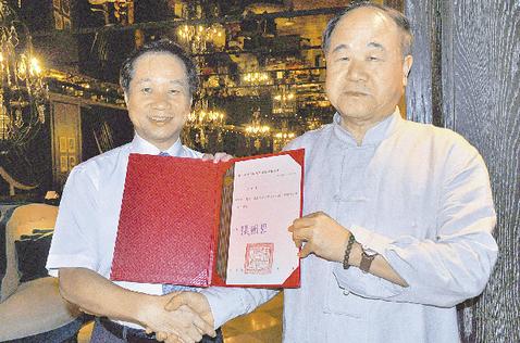 臺(tái)師大校長(zhǎng)張國(guó)恩(左)正式將聘書交給莫言,邀請(qǐng)他擔(dān)任講座教授。(圖片由臺(tái)師大提供)