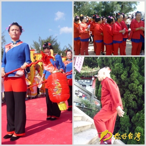 湄洲女服飾叫“媽祖裝”,海蘭色斜搭襟的中式上衣代表著大海的藍(lán);相處,媽祖喜愛紅色褲子,下黑上紅的寬大褲子是由于媽祖常年在海上救助漁民,褲子被海水打濕后遠(yuǎn)遠(yuǎn)看去像黑色,而上半截沒(méi)有被海水打濕的部分還是紅色的,久而久之衍化為上紅下黑的款式,紅黑分別象征吉祥與思念。
