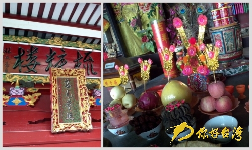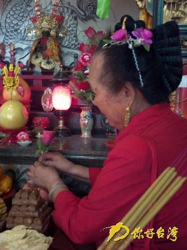 梳妝樓里的供品讓人印象深刻。幾個(gè)紅色的塑料盤里托著各式各樣的化妝品,種類繁多,有護(hù)膚品、有粉餅,還有頭飾。媽祖像前長(zhǎng)期放置的一排供品也很有特色,香菇、餅、豆干等各種素食整齊地疊放,呈上小下大的寶塔狀,每個(gè)寶塔的頂端都插上一朵小紅花;蛟S,媽祖生前也愛紅花吧?