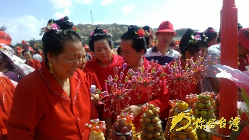 青浦底澳口海灘,島上14個(gè)村子的湄洲女趕來(lái)祭拜媽祖,供桌前,他們用心裝點(diǎn)著祭祀媽祖的供品,把他們打扮得如同自己的服飾——喜慶富貴、花枝招展……
