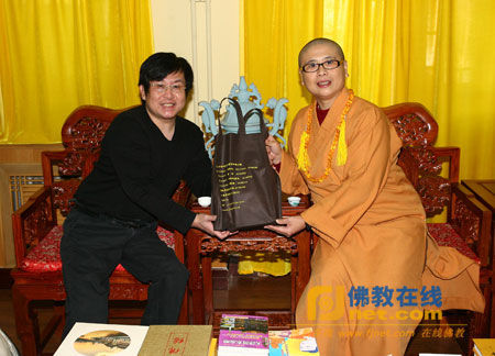 薦福觀音寺住持妙賢法師向歌星鄭智化贈送禮品