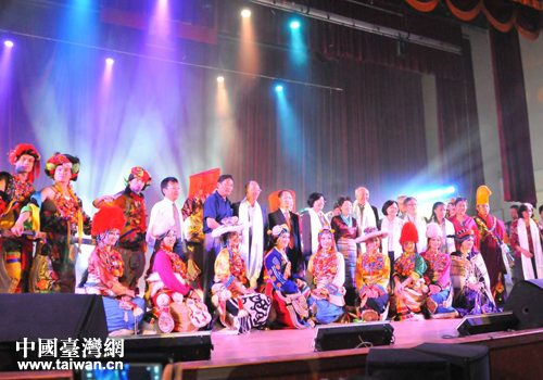 四川民族歌舞赴臺(tái)交流團(tuán)在彰化舉行第四場(chǎng)巡演,圖為演出結(jié)束后交流團(tuán)成員合影。