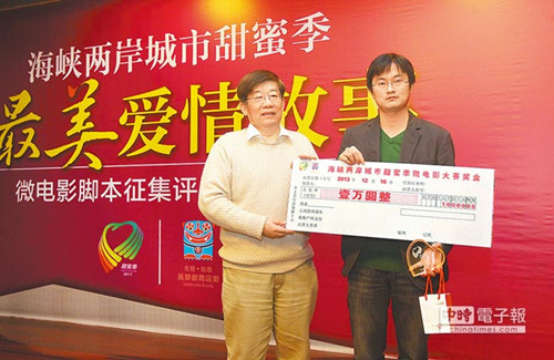 據(jù)臺(tái)灣《旺報(bào)》報(bào)道,第三屆兩岸城市甜蜜季愛(ài)情微電影故事評(píng)選結(jié)果揭曉,16日在廈門(mén)日?qǐng)?bào)社舉行頒獎(jiǎng)儀式。