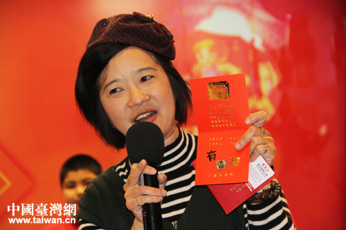 臺南文化協(xié)會的代表在現(xiàn)場向?qū)亳R的臺胞派發(fā)了喜氣洋洋的馬年“紅包”。(中國臺灣網(wǎng) 楊永青 攝)