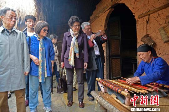 兩岸藝術(shù)家在景區(qū)觀看黎族阿婆織黎錦。 駱云飛 攝