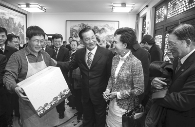 昨日,中國國民黨榮譽(yù)主席連戰(zhàn)夫婦向小提琴制作師常中秋贈送禮物。張浩 攝
