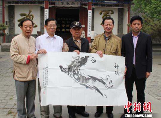 全球中華粥會(huì)副會(huì)長(zhǎng)、天馬花會(huì)創(chuàng)會(huì)人孫晉卿(左一)創(chuàng)作“天馬”圖贈(zèng)送給保定軍校紀(jì)念館!