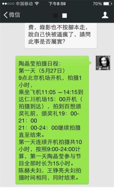 據(jù)騰訊娛樂報(bào)道,繼雙方互發(fā)聲明暗戰(zhàn)之后,陶晶瑩退出東南衛(wèi)視明星夫妻真人秀《真愛在囧途》的事件被臺(tái)灣媒體高度關(guān)注,除《聯(lián)合報(bào)》等當(dāng)?shù)貓?bào)紙跟蹤報(bào)道,陶晶瑩還現(xiàn)身臺(tái)灣某綜藝節(jié)目,抱怨大陸節(jié)目錄制太苦。周四晚《真愛在囧途》播出第三期后,節(jié)目出品人之一、擴(kuò)納CEO馬雪當(dāng)晚在個(gè)人微博上傳截圖,曝光節(jié)目拍攝日程,截圖顯示陶晶瑩夫婦的錄制時(shí)間其實(shí)只有陳赫、王錚亮兩對(duì)夫婦的一半。