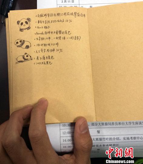 2月10日,臺大學(xué)生陳宇威在聽課記錄本上畫了許多大熊貓的各種動態(tài)。 張麗君 攝