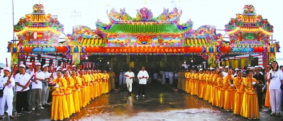 陳靖姑金身巡游臺灣成為臺灣民間最隆重的節(jié)日,臺灣民眾在臺北市設(shè)立宏偉而隆重的行宮歡迎陳靖姑金身的到來,成為當(dāng)?shù)氐囊坏里L(fēng)景線。杜新華 攝
