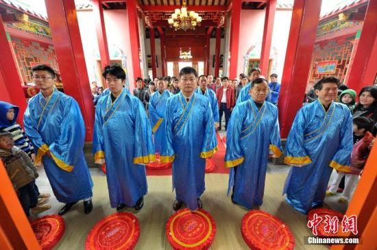 資料圖:2014年12月13日,孔子第78代孫、臺灣孔子協(xié)會理事長、臺灣孔子學(xué)院院長孔維勤攜臺灣儒家文化代表團(tuán),海南孔子后人在擁有606年歷史的海口市美新村孔廟進(jìn)行祭拜儀式。中新社發(fā) 駱云飛 攝