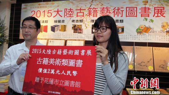 5月12日,2015大陸古籍藝術(shù)類圖書展大陸代表團(tuán)團(tuán)長(zhǎng)崔曉軍(左)向花蓮市立圖書館贈(zèng)送了天津楊柳青畫社在內(nèi)多家出版社《中國(guó)畫技法》等一批古籍美術(shù)類圖書。 劉舒凌 攝