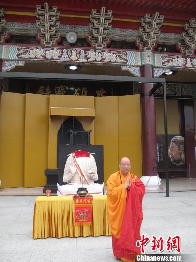 儀式開始前,天上開始落小雨。在16位佛光山法師的唱誦聲中,運(yùn)載著佛身的木箱由工作人員打開,佛光山住持心保和尚在佛身前合掌默誦,捻香三根,僧眾共同誦經(jīng)、回向后,禮成。