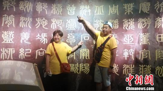 臺灣學(xué)生發(fā)現(xiàn)自己的姓氏也在百家姓展板上,特別開心地讓同行的朋友幫忙合影留念!×蛀惥z