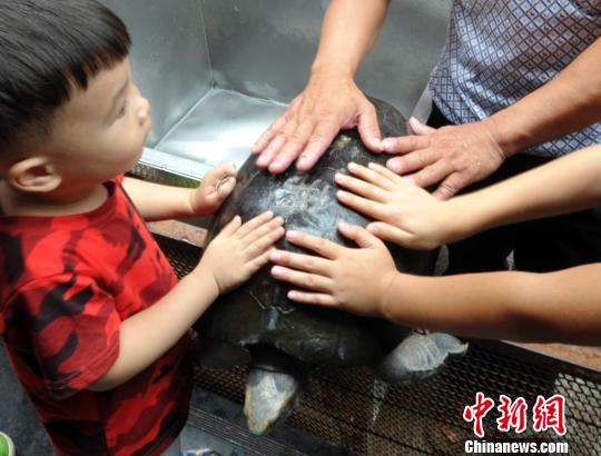 孩子們在大人的指引下輕輕地?fù)崦办`龜”龜背!∮嗟ぁz