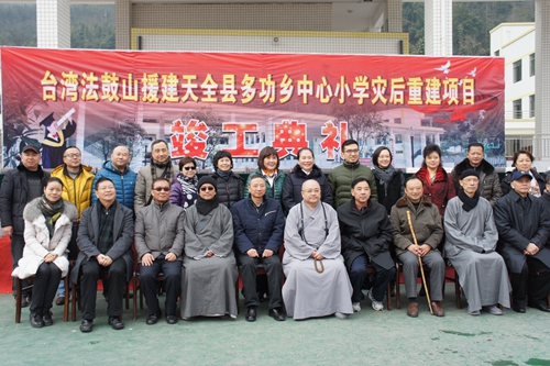 中國臺灣網1月22日四川訊 1月21日,臺灣法鼓山援建“4.20”蘆山地震災后重建項目——雅安天全縣多功鄉(xiāng)中心小學舉行竣工儀式。四川省臺辦主任周敏謙、省人大民宗委主任王增建、省民宗委副主任楊伯明與臺灣法鼓山住持果東法師等出席竣工典禮并為學?⒐そ遗。來自臺灣、香港等地的法鼓山信眾、義工和當地群眾師生200余人參加竣工儀式。