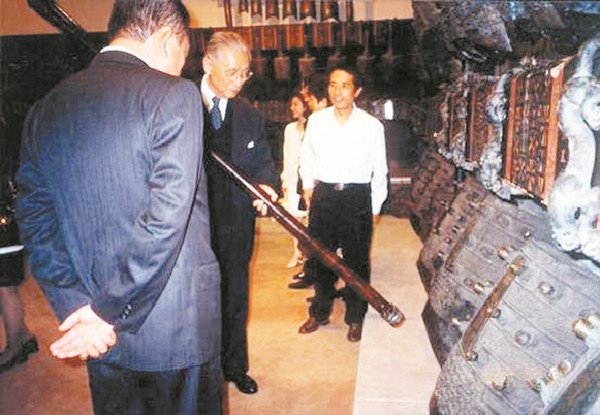 ;鶗(huì)董事長辜振甫觀看“湖北省博物館藏品精華展”,并饒有興趣地試著曾候乙編鐘。