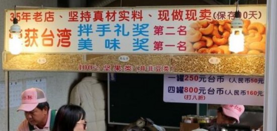 日月潭水社碼頭旁的杏仁酥?jǐn)傇O(shè)身處地為陸客著想,將攤位改成簡(jiǎn)體字、售價(jià)也用人民幣標(biāo)示清楚,反而在這一波陸客減少潮中未受沖擊。(圖片來(lái)源:中評(píng)社)