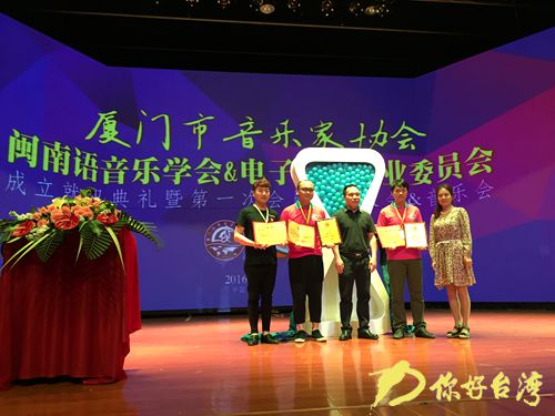 廈門音協(xié)秘書長黃文娟、黃啟發(fā)為電子音樂專委會秘書長、閩南語音樂學(xué)會秘書長 、閩南語音樂學(xué)會監(jiān)事長授牌(你好臺灣網(wǎng) 圖)