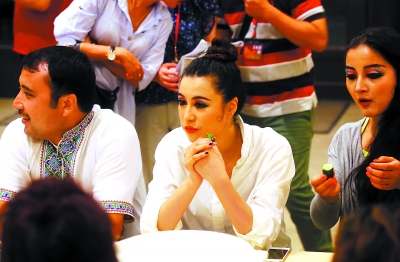 4月5日清晨5時多,古麗敏仁和十多位伙伴帶著家鄉(xiāng)人烤出的馕出發(fā)了。整整兩天,行程1萬多公里,大家才終于抵達了演出第一站——臺灣臺中市。寶島的空氣真濕潤啊,滿目綠意盎然。走出大漠走進寶島的第一天,古麗敏仁就被迷住了?深櫜簧闲蕾p美景,古麗就和同伴們投入了緊張的排練。和田樂舞以其熱情奔放的魅力常常被安排為整場演出的壓軸。這意味著無論排練還是演出,姑娘們都要付出更長時間的等待,但這可沒能讓古麗犯難。團里為這次寶島之行準(zhǔn)備了4個精品節(jié)目,每個節(jié)目的服裝服飾截然不同。一次不到十分鐘的登臺表演最多需要長達三個小時的化裝準(zhǔn)備。維吾爾姑娘獨特的化裝風(fēng)格和技巧甚至吸引了眾多同行來學(xué)習(xí)!八齻兊幕b更偏向戲劇感,棱角分明層次突出。”內(nèi)蒙古歌唱家格日樂圖雅連學(xué)三天,忍不住贊道。