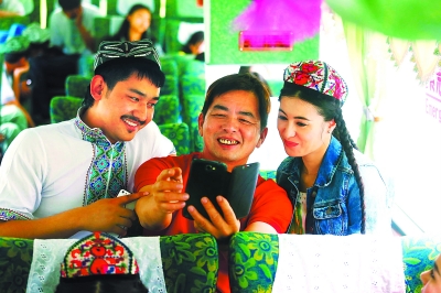 ▲ 在演出地點之間轉(zhuǎn)場動輒幾個小時,早出晚歸成了文化之旅團員們的常態(tài),而大巴車則成了演員們臨時的“家”。一直跟隨著演出團四處奔波的當(dāng)?shù)貙?dǎo)游跟著團隊看了一場又一場表演,直言自己已經(jīng)是鐵桿粉絲,閑暇時間他還會把自己在觀眾席上錄下的演出視頻拿出來回放,請演員們一同欣賞回味。