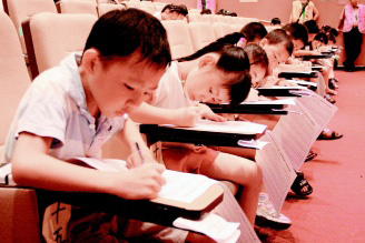 “海峽兩岸狀元杯心算暨數(shù)學(xué)公開邀請(qǐng)賽”12日在臺(tái)灣桃園縣舉辦,幼童快速心算,現(xiàn)場(chǎng)寂靜無聲。(圖片來源:臺(tái)灣《聯(lián)合報(bào)》)