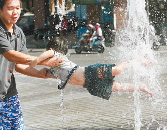 昨天新竹飆到39.4度今年最高溫,各地天氣熱到讓小朋友受不了,由大人抱到噴水池邊沖涼消暑。(圖片來源:臺灣《聯(lián)合報》)