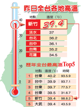 據(jù)報道,昨天高溫都出現(xiàn)在臺灣北部,除了新竹,第二、第三高溫分別是淡水與臺北。