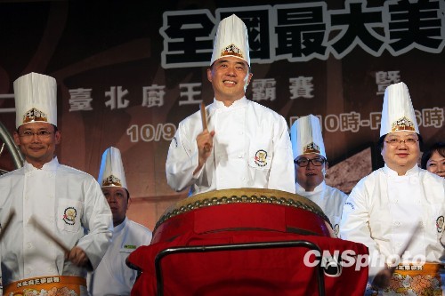 10月9日,臺北市長郝龍斌(中)一身廚師裝,擊鼓為第二屆臺北廚王爭霸賽暨2009臺北國際廚王邀請賽熱鬧揭幕。他表示,要將中華傳統(tǒng)美食發(fā)揚(yáng)光大,努力打造臺北成為“世界美食之都”。該比賽先從臺灣廚藝高手進(jìn)行爭霸賽,參賽者以鯖魚、鴕鳥肉與頂級腓力牛肉三種指定食材做出料理,決出優(yōu)勝者,再于12日和來自廣州、北京、上海、香港和新加坡、馬來西亞等地的“廚神”,切磋中華美食技藝,爭奪臺北國際廚王邀請賽的“廚王”桂冠。中新社發(fā) 黃少華 攝