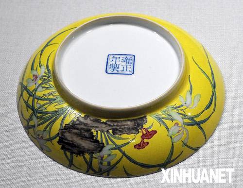 這是10月6日在臺(tái)北拍攝的清雍正瓷胎畫琺瑯黃地芝蘭圖盤。新華社發(fā)(吳景騰 攝)