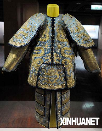這是10月6日在臺(tái)北拍攝的雍正皇帝御用鎧甲“月白緞繡金龍銅釘棉甲”新華社發(fā)(吳景騰 攝)