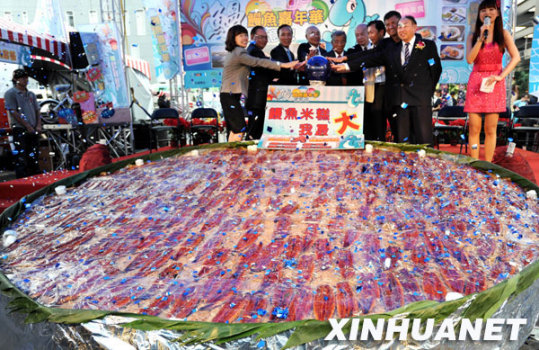 當(dāng)天,為推廣促銷臺灣優(yōu)質(zhì)養(yǎng)殖水產(chǎn)品,“2009鰻魚嘉年華——鰻有意思”活動在臺北市舉行,現(xiàn)場展示了周長9.99米的大型鰻魚米糕,并開展各項魚產(chǎn)品試吃活動。新華社發(fā)(吳景騰 攝)