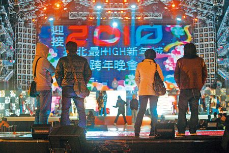 為迎接2010年,臺(tái)北市政府31日舉辦跨年晚會(huì),工作人員30日晚間趕緊測(cè)試燈光及舞臺(tái)設(shè)備,演員也加緊排練。圖片來(lái)源:中國(guó)時(shí)報(bào)