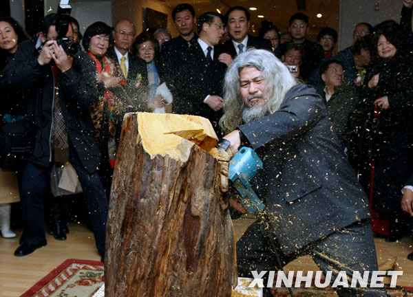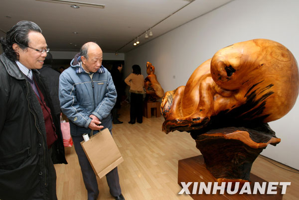當(dāng)日,“生命——康木祥2010上海木雕藝術(shù)展”在上海美術(shù)館開幕,臺灣著名木雕藝術(shù)家康木祥先生多年來的木雕精品首次在滬亮相?的鞠橄壬淖髌啡〔膶殟u臺灣的原生木和漂流木,通過雕刻藝術(shù)與木質(zhì)的天然特性相融合,孕育和傳達出“生命中的喜悅與愛”,具有濃烈的臺灣風(fēng)情。新華社記者 劉穎 攝