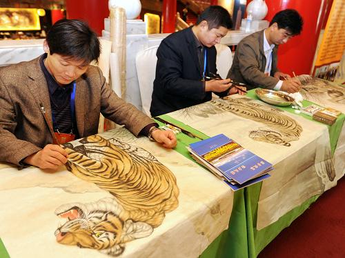 近日,作為河南省“中原文化寶島行”活動(dòng)之一的河南農(nóng)民畫展暨河南民俗藝術(shù)展在臺(tái)北開展;顒(dòng)旨在幫助臺(tái)灣民眾深入了解中原文化。圖為農(nóng)民畫家在開幕典禮上畫虎。新華社 吳景騰攝