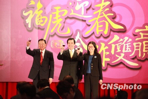 2月22日,“2010大陸臺商春節(jié)聯(lián)誼活動”在臺北圓山大飯店舉行,100多位大陸各地的臺商會長與會。圖為國民黨主席馬英九、臺灣;鶗麻L江丙坤、臺灣“陸委會”主委賴幸媛在主席臺上為臺商敬酒,祝賀大家新年虎虎生風、萬事順利。中新社發(fā) 閆曉虹 攝