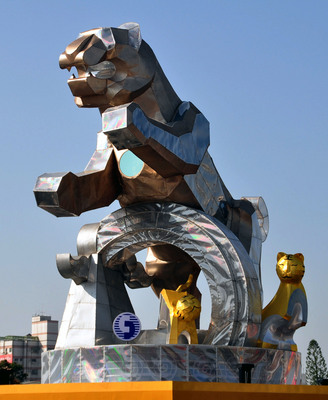 中新網(wǎng)2月24日電 據(jù)“中央社”報道,2010臺灣燈會主燈“福臨寶島”23日完成。亮灰色大虎加上2組金色Q版幼虎燈,不僅姿態(tài)宏偉,兼具歡樂溫馨氣氛,整體造型宏偉富巧思。