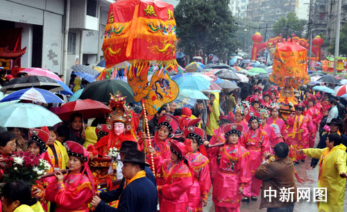 3月7日,來自海峽兩岸的26支臨水宮觀代表團共500多人,來到福州市倉山區(qū)下渡街陳靖姑出生地參加謁祖進香儀式。參加儀式的隊伍統(tǒng)一身著盛裝,抬著臨水夫人陳靖姑金身神像走進其出生地,依次對著神位虔誠朝拜。