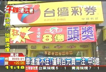 據(jù)TVBS報(bào)道,財(cái)神爺來(lái)敲門,真的是擋都擋不住。高雄有一名中年上班族平常都花1千元(新臺(tái)幣 下同)買彩券,這一次沒(méi)想到他發(fā)現(xiàn)身上的1千元不見(jiàn)了,把僅剩的100元拿來(lái)買一注威力彩,竟然獨(dú)得已經(jīng)連扛16期的頭彩,彩金8億,是威力彩史上第三高的頭彩。