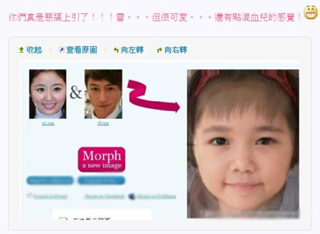 看到合成baby照,林心如直呼:“有趣!”并轉(zhuǎn)貼在自己的博客上,同戲的演員胡杏兒看到也留言說很可愛。陳鍵鋒也說:“很可愛,有點(diǎn)兒混血兒的感覺!”而網(wǎng)友也戲稱合成Baby照很有明星臉,酷似Ella、川島末樹代和湯姆克魯斯的女兒Suri。